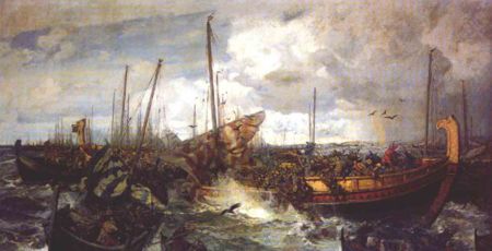 The Norse writers, who are the main authorities, gave all the credit to the Norwegians, and according to them all the intelligence of Olaf's enemies, and most of their valour, were to be found in Eirik. They say that the Danes and Swedes rushed at the front of Olaf's line without success. Eirik attacked the flank. His vessel, the Iron Ram (ON Járnbarđinn), was "bearded", that is to say, strengthened across the bows by bands of iron, and he forced her between the last and last but one of Olaf's line. In this way the Norwegian ships were carried one by one, till the Long Serpent alone was left. At last she too was overpowered. Olaf leapt into the sea holding his shield edgeways, so that he sank at once and the weight of his hauberk dragged him down.